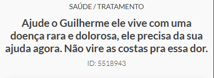 Guilherme, de apenas 9 aninhos, enfrenta um diagnóstico devastador. Com a saúde se deteriorando a cada dia por causa da epidermólise bolhosa, uma doença rara e dolorosa, sua única chance de sobreviver é com um tratamento contínuo, especializado e urgente.